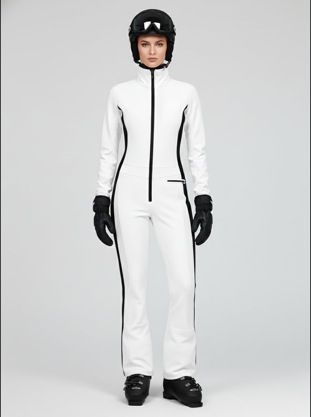 Distintivo traje de esquí de una pieza fabricado con el prestigioso tejido de Schoeller que realza la figura femenina, comodidad y protección. El mono de esquí que esperabas.